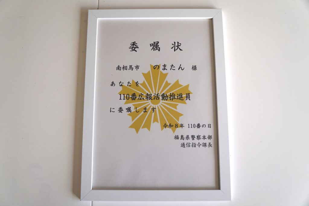 2026.01.23 のまたんが110番広報活動推進員に委嘱されました 1.トピック・NEWS Post Share Hatena Line RSS feedly Pin it note 2026年1月9日(金)に福島県警察本部に2階大会議室にて、令和8年110番の日広報活動が実施されました。 のまたんが110番広報活動推進員に委嘱されました。 警察本部2階大会議室や通信指令室で撮影が行われました 2会大会議室にて撮影 通信指令室にて 委嘱状をいただきました 委嘱状 これからも、110番の日の広報活動に努めてまいります。 Post Share Hatena Line RSS feedly Pin it note この記事のタイトルとURLをコピーする 南相馬市内にある郵便局の隣接するポストに『のまたん』が掲載されております 前の記事 南相馬市ふるさと回帰支援センター 南相馬市ふるさと回帰支援センターは、道の駅南相馬の建物内にございます。地域間交流などを行っております。のまたんは、南相馬市ふるさと回帰支援センターのマスコットキャラクターです。 https://minamisouma-furusato-kaiki.jp/ Instagram X Youtube Contact